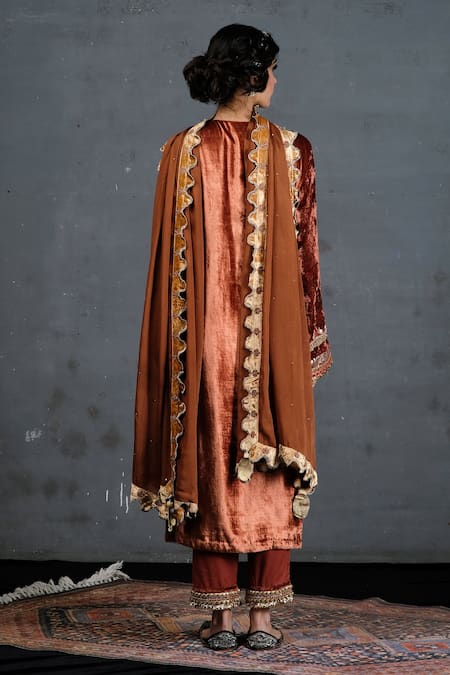 Rust velvet kurta with floral embroidery on the yoke and side slits. Comes with palazzo and dupatta.