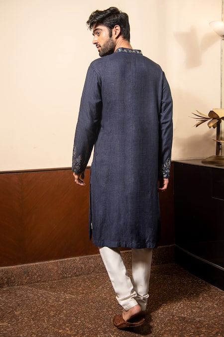Navy blue kurta featuring floral foil print on the placket, sleeve hem, and pintuck detailing. Paired with a contrast pyjama and includes side pockets and side slits.