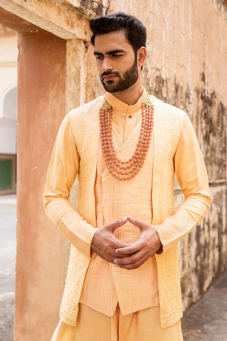 Saffron kurta paired with an embroidered jacket and front pleated details. Comes with a churidar pant.