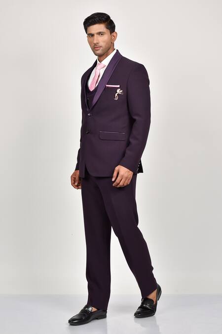 Wine tuxedo featuring a shawl collar, long sleeves, and flap pockets. Paired with a waistcoat, pant, and a white shirt with a tie.