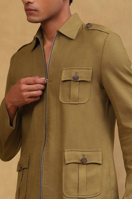 Olive green full sleeve jacket featuring a spread collar, front zipper closure, and side pockets. Paired with matching pants in a plain design.