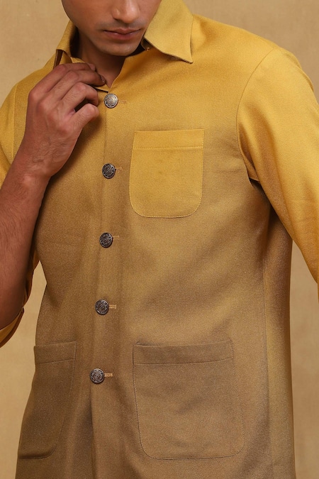 Yellow ombre shirt featuring a spread collar and front button detailing. Paired with matching pants that include side pockets.