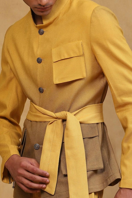 Mustard yellow ombre jacket featuring a band collar, full sleeves, and front button detailing. Paired with matching pants and a waistbelt, complete with side pockets.