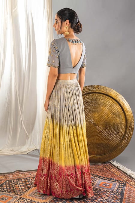 Grey Silk Blend Cutdana And Sequin, Foil Print, Beads V Neck Ombre Lehenga Set