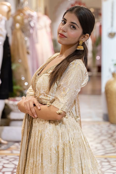 Ivory lehenga featuring paisley print and embroidery details. Paired with an embroidered blouse and coordinating dupatta.