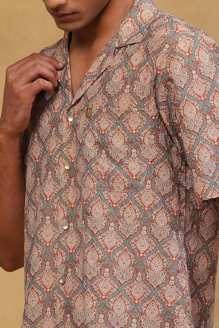 Brown shirt featuring a paisley print, notched lapel collar, and half sleeves. Paired with matching shorts that have side pockets and an elasticated back.