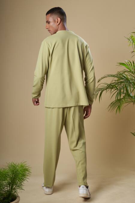 Pastel green hand embroidered T-shirt in stag motif with shoulder zipper detail. Paired with solid pant.