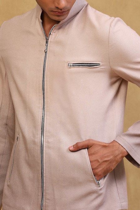 Beige high neck jacket featuring full sleeves and a front zipper closure. Paired with matching beige pants that include side pockets.