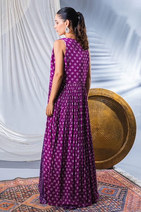Purple cape with printed motifs, tassel detail on the border and mirror work. Comes with tie dye blouse and lehenga.