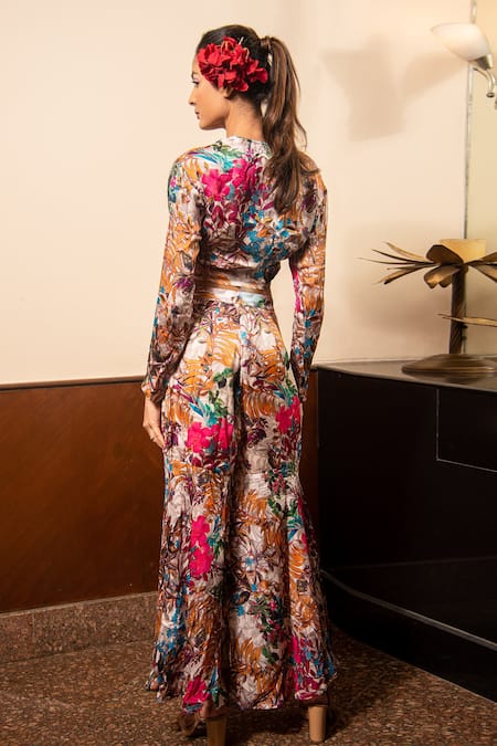 Ivory Satin Embroidery V-neck Printed Knotted Top And Pant Set