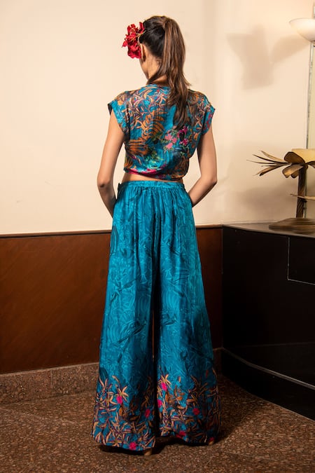 Blue Satin V-neck Printed Top And Pleated Pant Set
