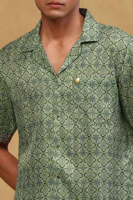 Bottle green shirt featuring a quatrefoil print, notched lapel collar, and half sleeves. Paired with matching shorts that include side pockets and an elasticated back.