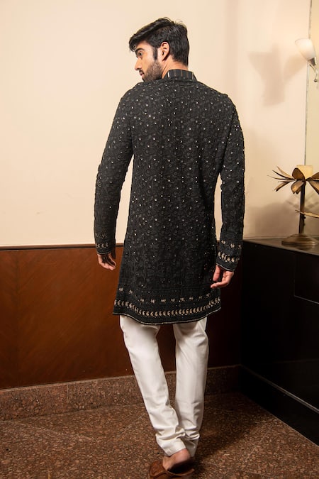 Black kurta featuring thread embroidery with sequin, floral patterns on one side and lurex stripe pattern on the other. Paired with a contrast pyjama and includes side pockets and a front concealed button placket.