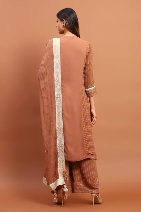 Brown Georgette Embroidery, Sequins Keyhole Neck Placement Kurta Set