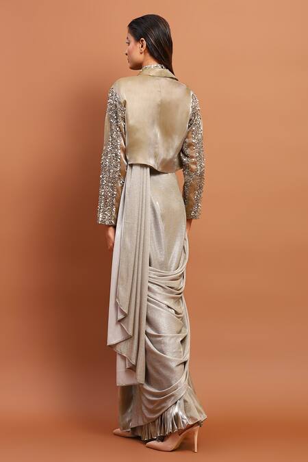 Gold shimmer lycra pre-draped saree featuring pleated organza panels and an attached draped pallu. Paired with a crop jacket adorned with tonal sequins, cut dana, and bead hand embroidery, along with a high neck sleeveless blouse.