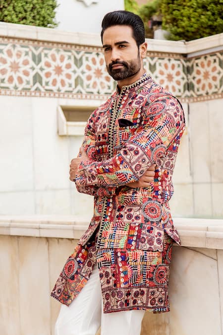 Multicolored bundi highlighted with tone-on-tone floral print, band collar and sleeveless. Comes with kurta and box pant.