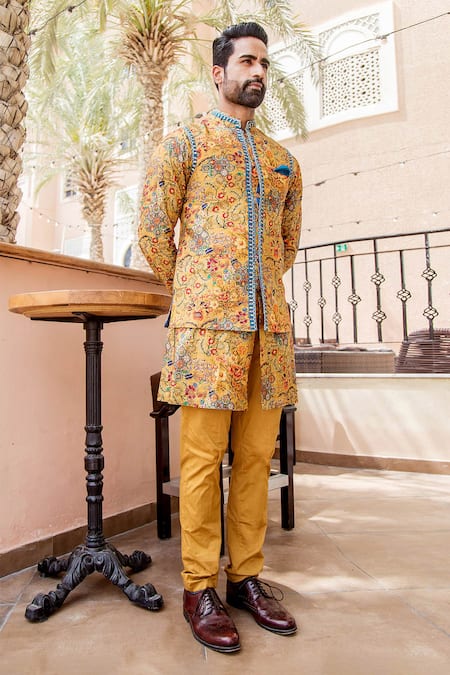 Mustard bundi highlighted with tone-on-tone floral print, band collar and sleeveless. Comes with kurta and box pant.