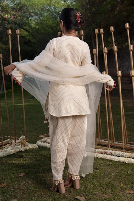 Ivory kurta featuring an embroidered patch pocket and all-over lurex striped pattern. Paired with matching pant and dupatta, designed with tassel detailing.