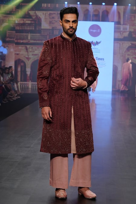 Wine velvet zari embroidered sherwani. Comes with palazzo.