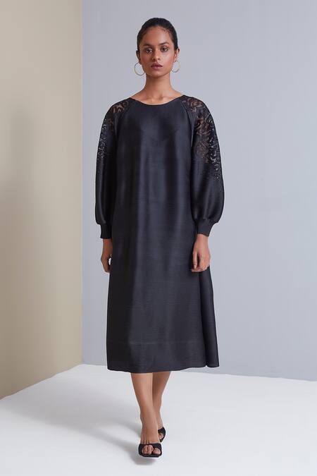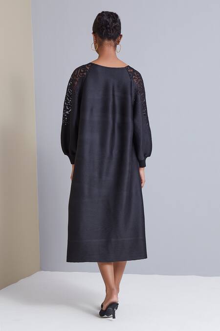 Black pleated dress with lace work on sheer panel & pleated all-over.