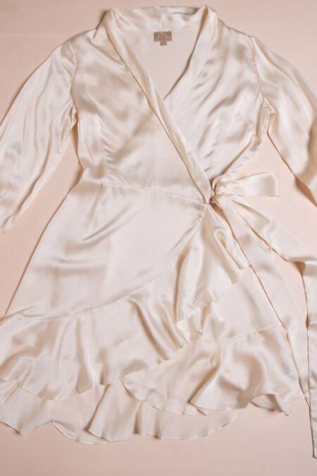 Ivory silk satin wrap dress with ruffles detail, overlap bodice & V neckline.