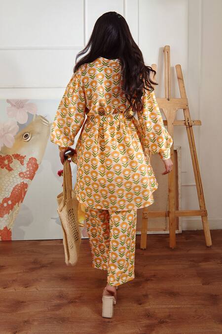 Ivory handloom silk chanderi flared oversized shirt with yellow digital floral print. Comes with pant and a self-tie wooden buckle belt.
