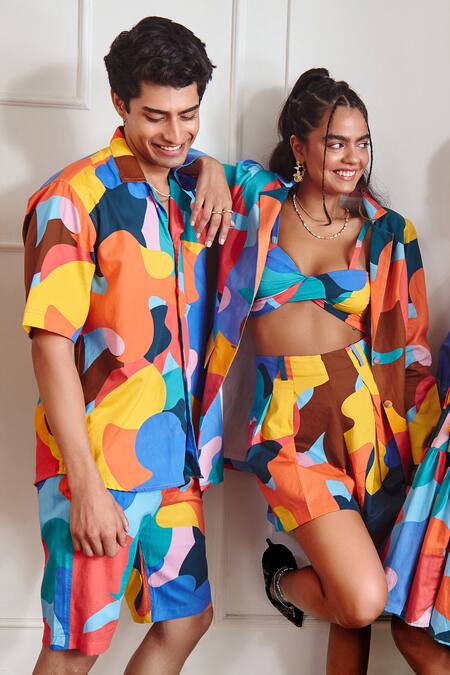 Multicolor cotton satin shirt with camo print all over & cuban collared neckline. Paired with shorts.