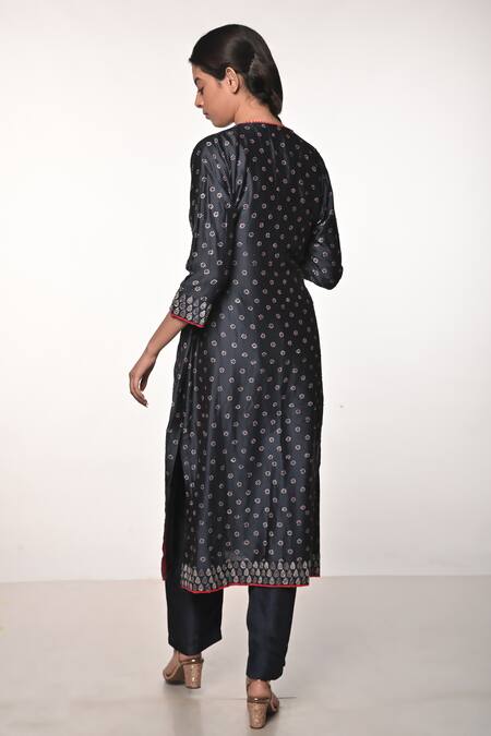 Buy_Soumodeep Dutta_Blue Chanderi, Cotton Embroidery Split Block Print Kurta And Straight Pant Set_Online_at_Aza_Fashions