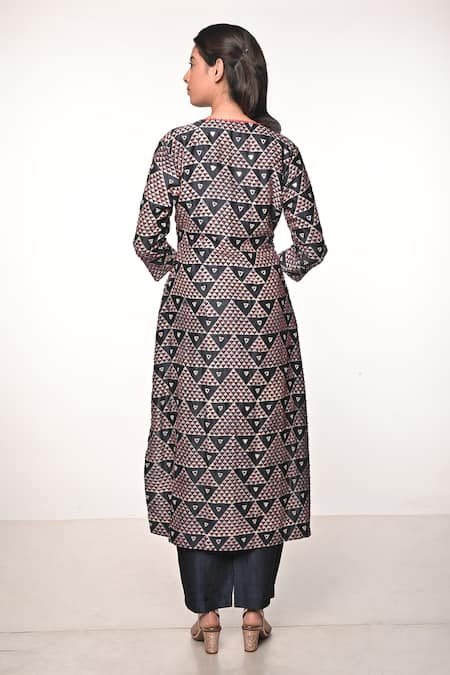 Blue chanderi kurta featuring triangle print, red French knot detailing & white mirror embroidery. Paired with straight fit pant.