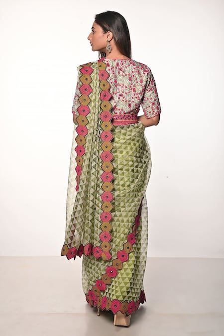 Green silk organza saree featuring block print and kutch thread & mirror hand embroidered borders. Accompanied by a heavily embroidered blouse and a matching belt.
