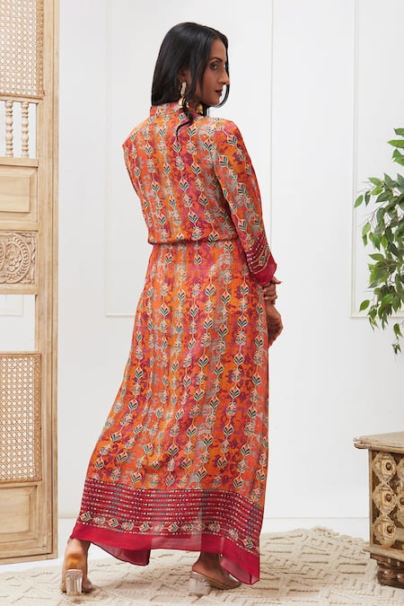 Maroon crepe maxi dress featuring an abstract print and front zip closure