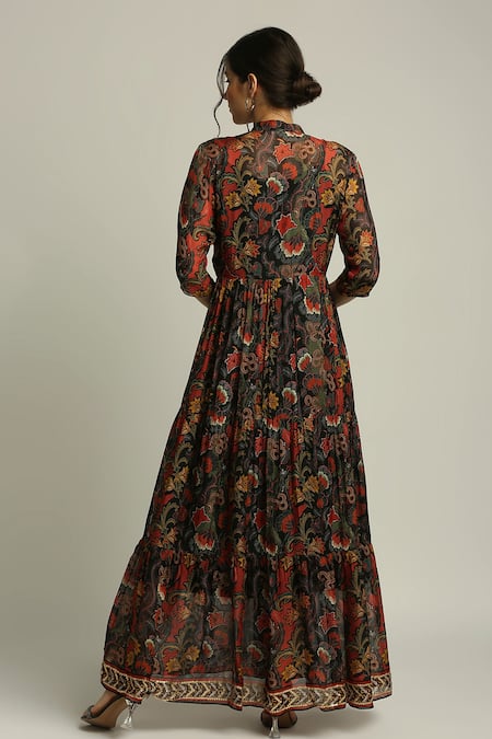 Black chiffon batik print dress with sequin embroidered detail.