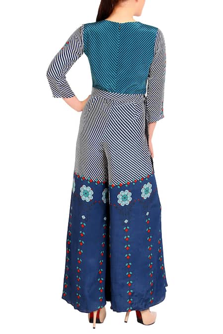 This quirky Crepe jumpsuit features a fusion of stripe and floral print details. It has a loose, relaxed fit with a tie-up belt at the waist.