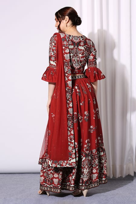 Merlot red lehenga with floral printed motifs & tiered detail. Paired with printed blouse & printed dupatta.