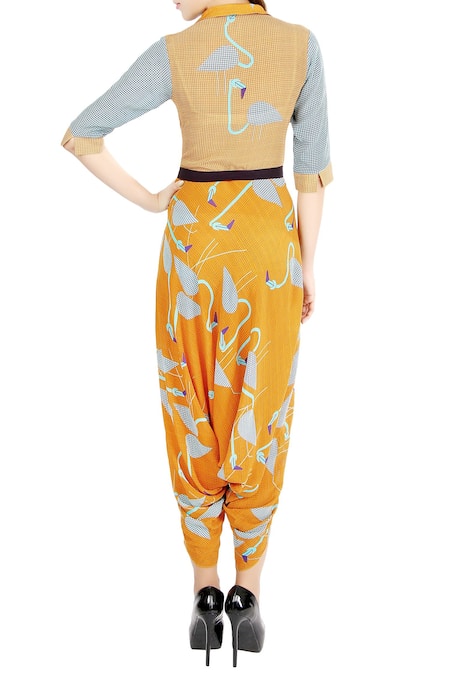 Orange & navy blue dhoti-style jumpsuit with bird printed motifs & checkered detail.