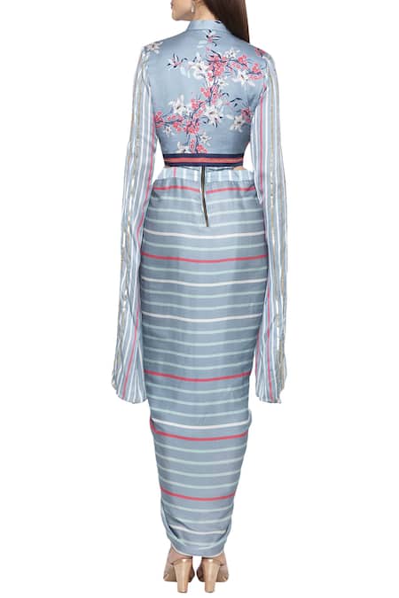 Blue draped dress with printed stripes & sequin accents. Paired with a floral printed short jacket.