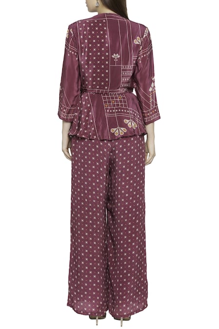 Magenta peplum-style jumpsuit with all-over printed motifs & wrap tie-up detail.