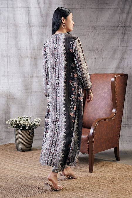Brown printed kurta featuring floral and chevron patterns with full sleeves and a U neckline. Paired with matching pants, this set includes a front slit design and attached lining for added comfort.