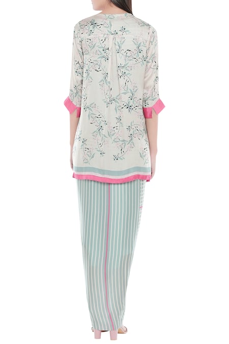 Grey maxi dress with all-over stripes & front drape. Comes with a contrast floral print jacket.