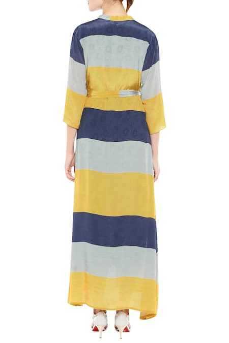 Blue crepe printed jumpsuit with draped silhouette. Teamed up with yellow and blue striped long jacket.