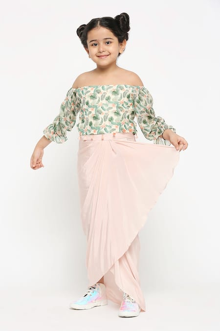 Pink draped skirt featuring a detailed ruffle design. Paired with a printed off-shoulder top with frill sleeves.