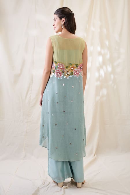 Hand-embroidered floral motifs on the jacket, Wide leg pants with side slits, Padded bralette for added comfort