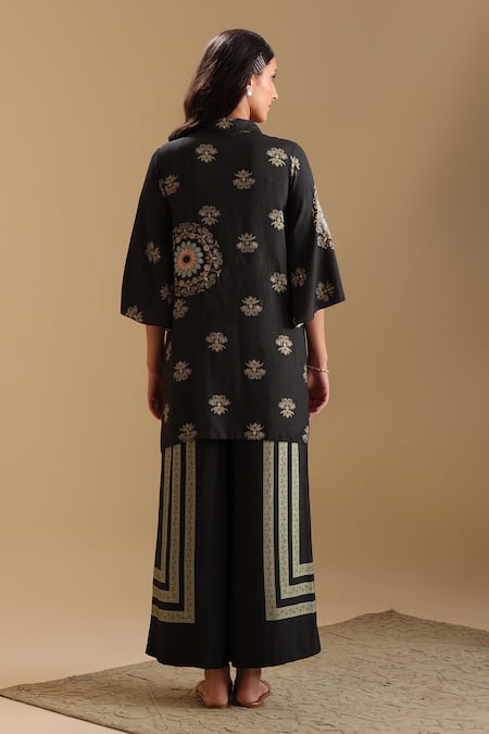Black cotton silk kurta featuring floral mandala prints and sequin embellishments. Paired with a pant showcasing printed panels for a coordinated look.