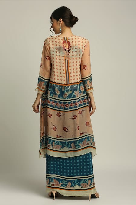 Peach organza floral print jacket. Paired with printed draped skirt and tent top.