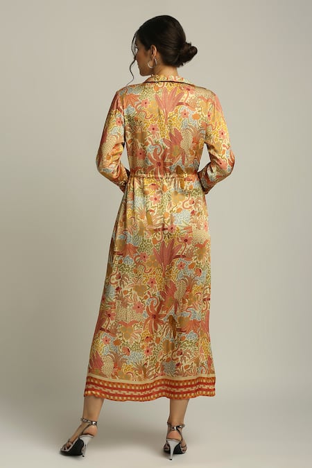 Yellow Satin Forest Print Straight Collar Groove Dress