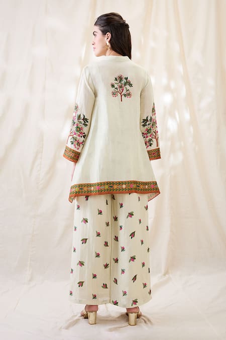 Beige tunic featuring hand embroidery with floral motifs and a straight cut. Paired with matching beige pants adorned with floral prints.