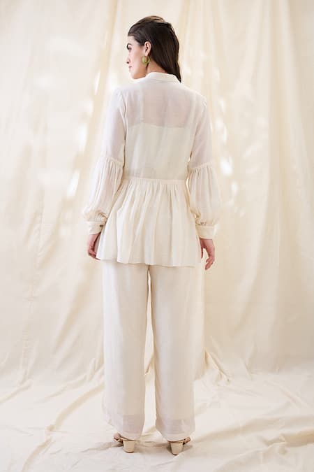 White Linen Embroidery Mandarin Gulzaar Appliqued Peplum Top And Palazzo Set