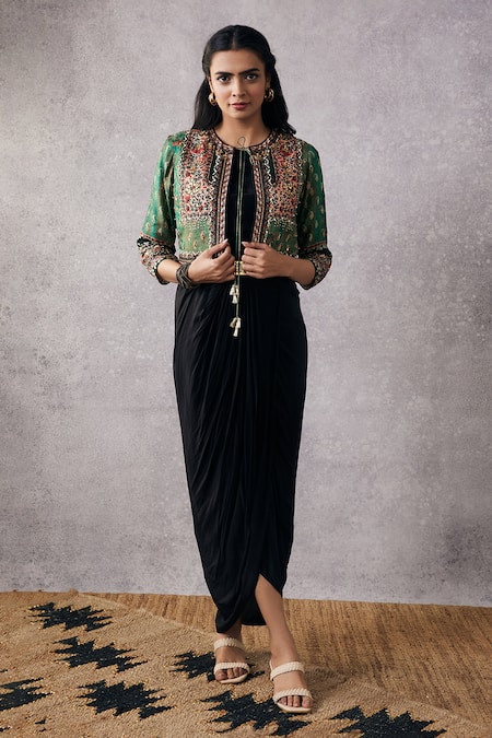 Black crepe draped dress featuring a round neck and pleated cowl drapes. Paired with a short jacket adorned with paisley, floral print, and contrast borders along with sequin and bead hand embroidery.
