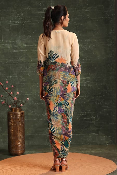 Buy_Soup By Sougat Paul_Beige Crepe, Organza Brooches Kaira Tropical Print Draped Dress With Jacket