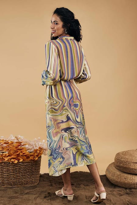 Multicolor cotton silk dress featuring all-over marble prints and a collared neckline